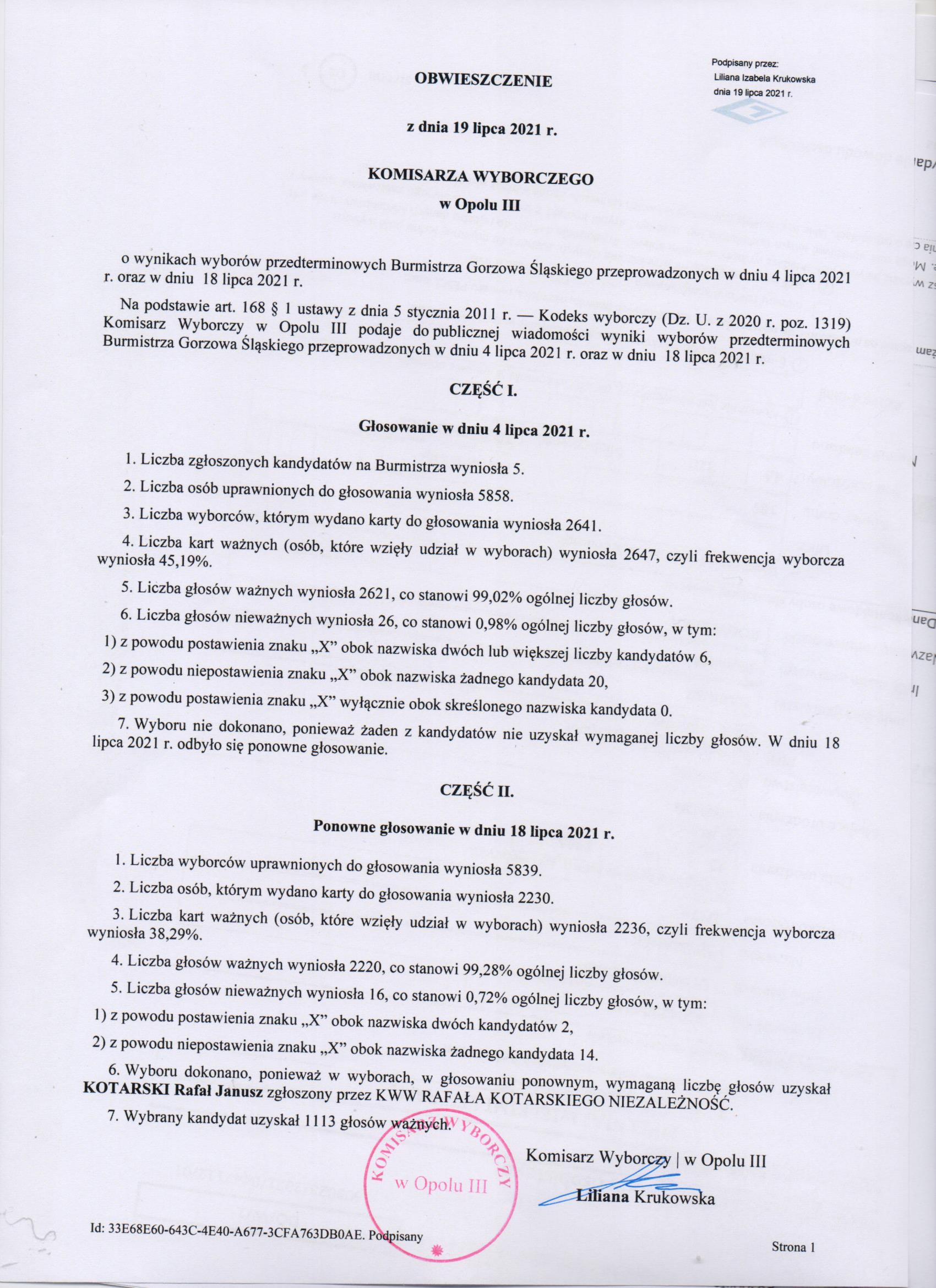Obwieszczenie Komisarza Wyborczego w Opolu III o wynikach wyborów przedterminowych Burmistrza Gorzowa Śląskiego, przeprowadzonych w dniu 4 lipca 2021 roku oraz w dniu 18 lipca 2021 roku.