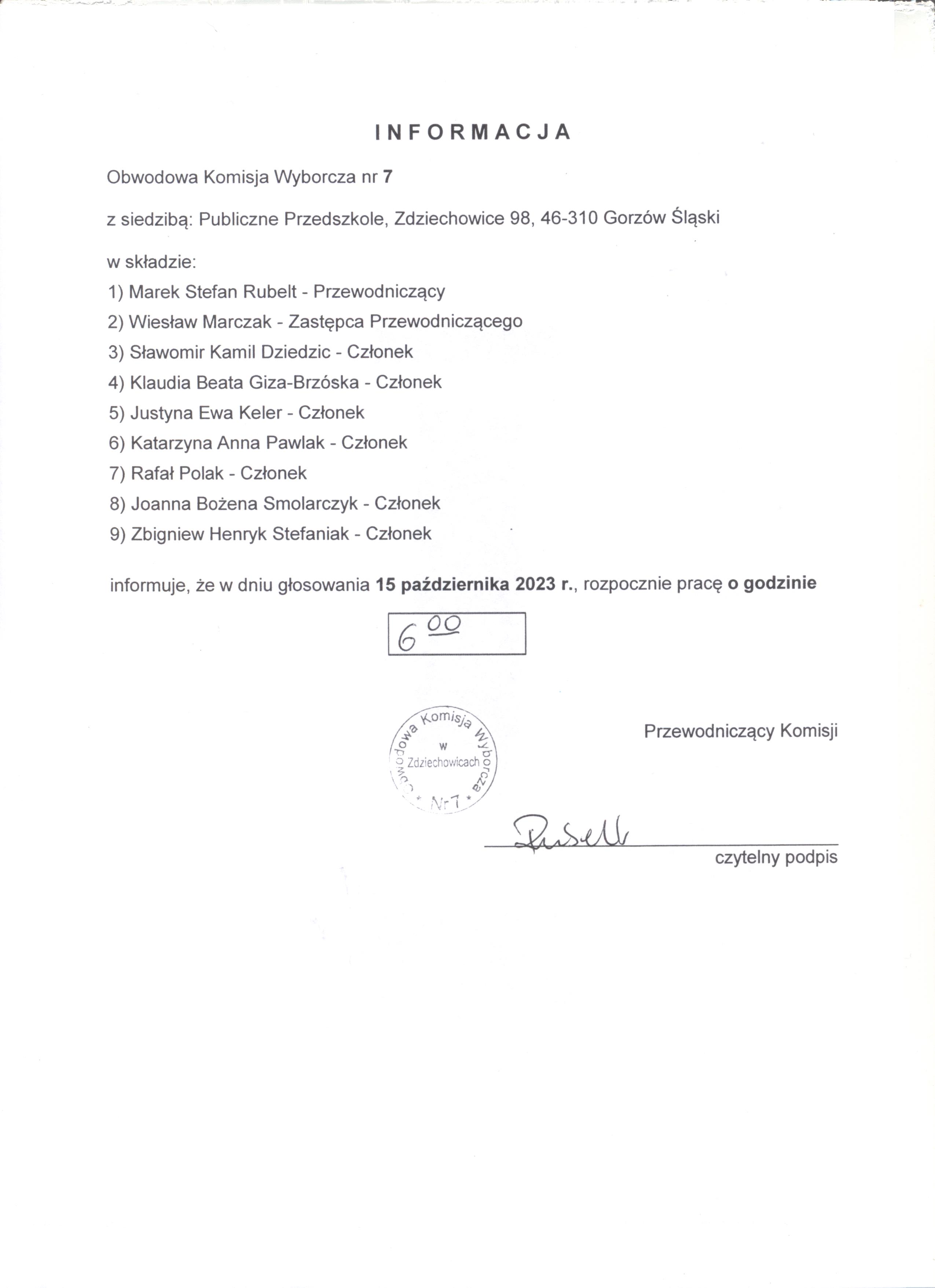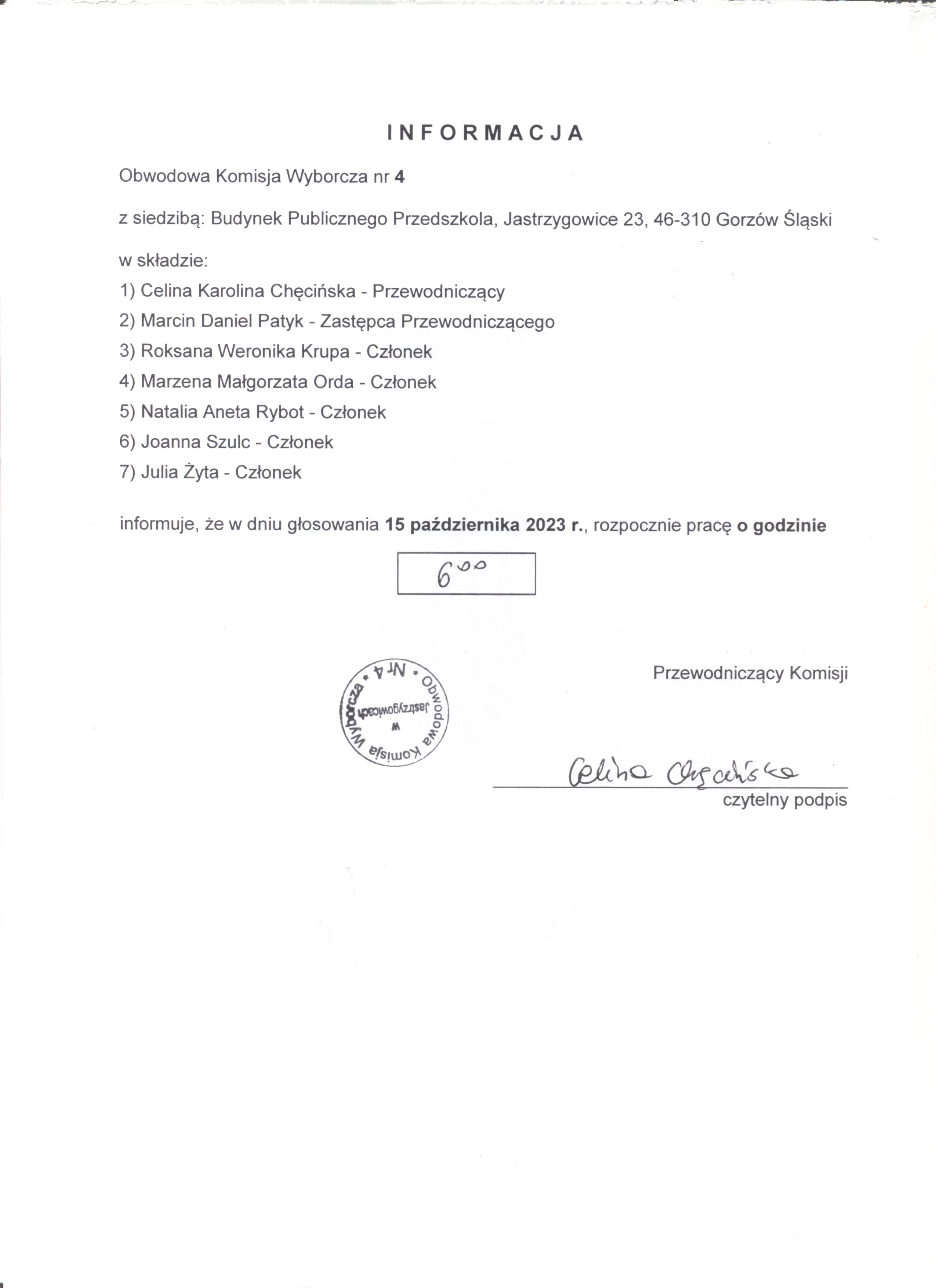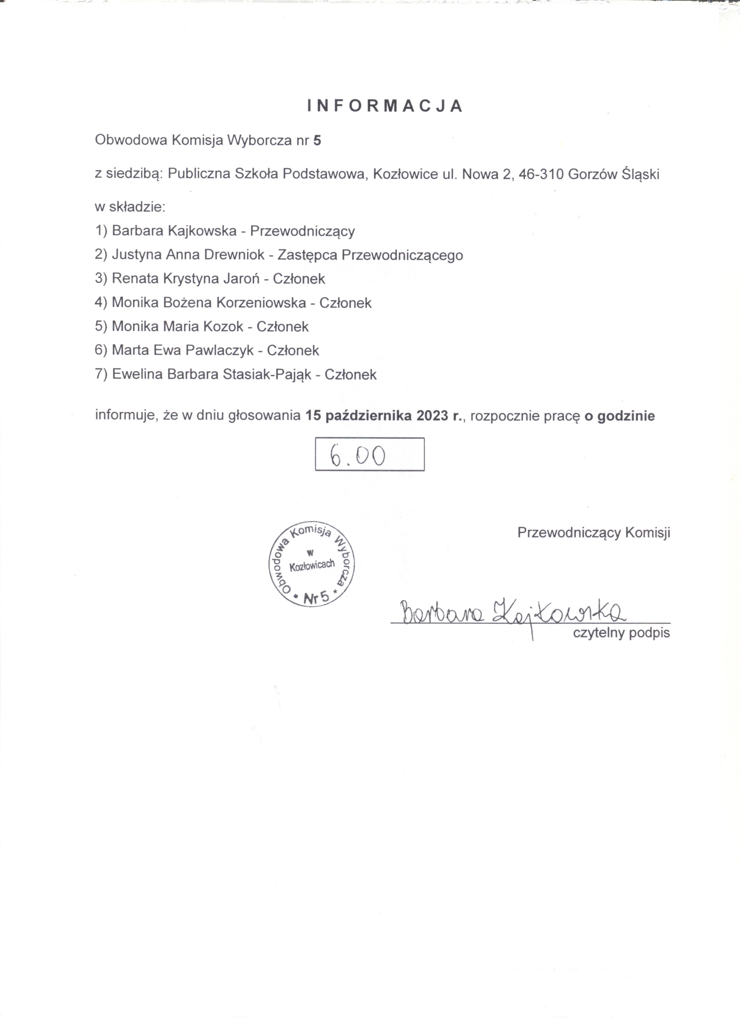 informacja o godzinie rozpoczęcia prac Obwodowych komisji wyborczych