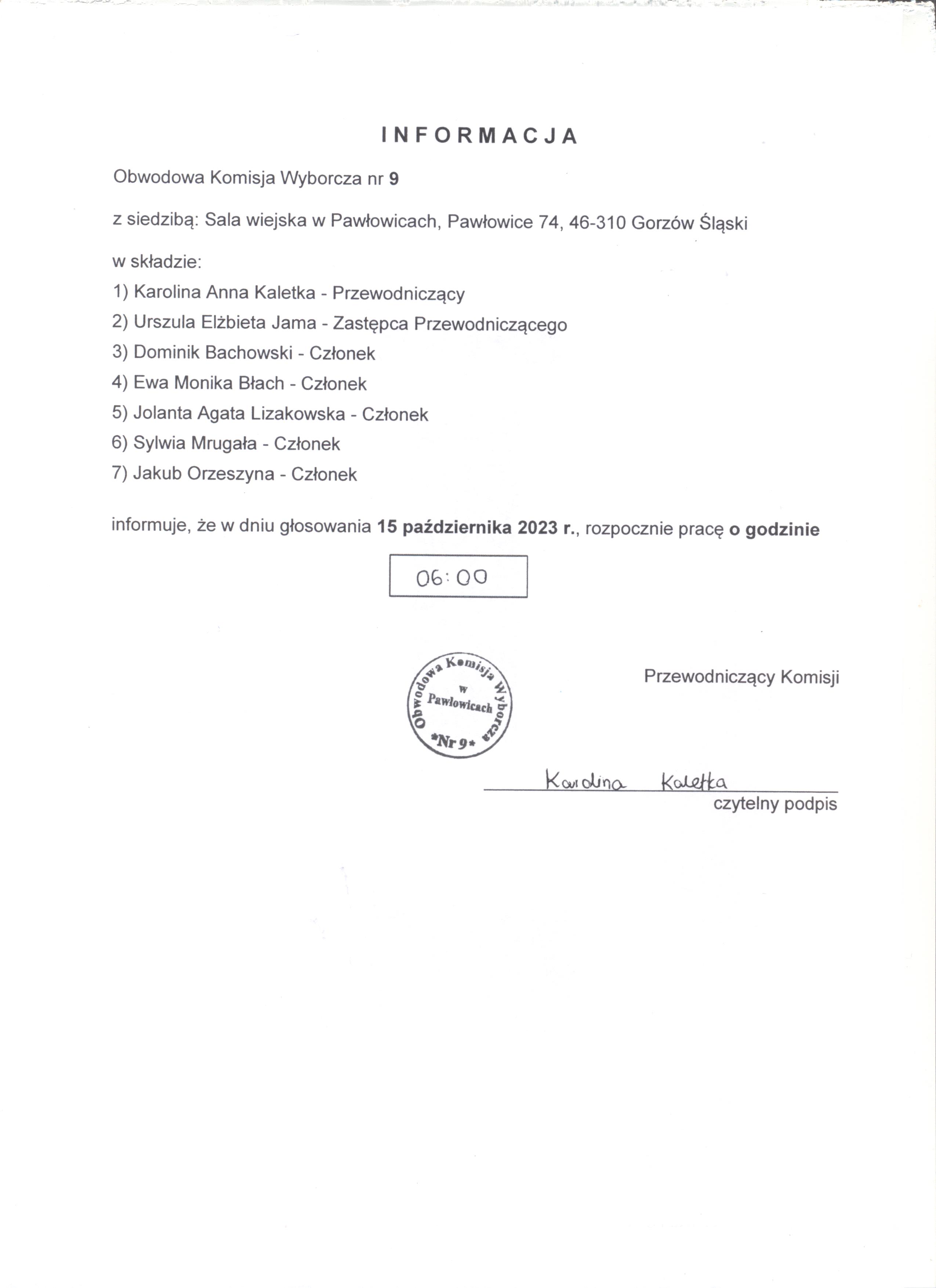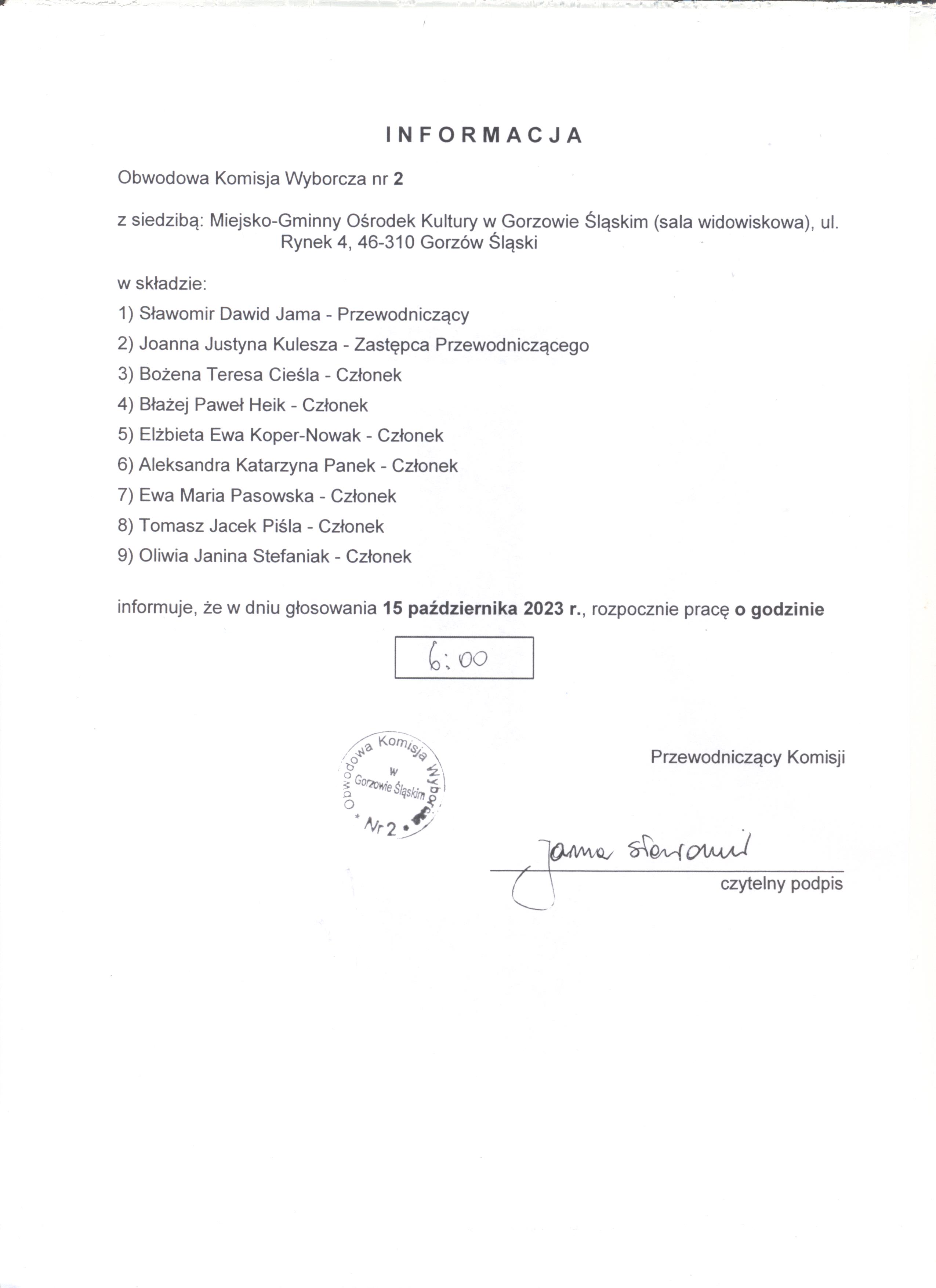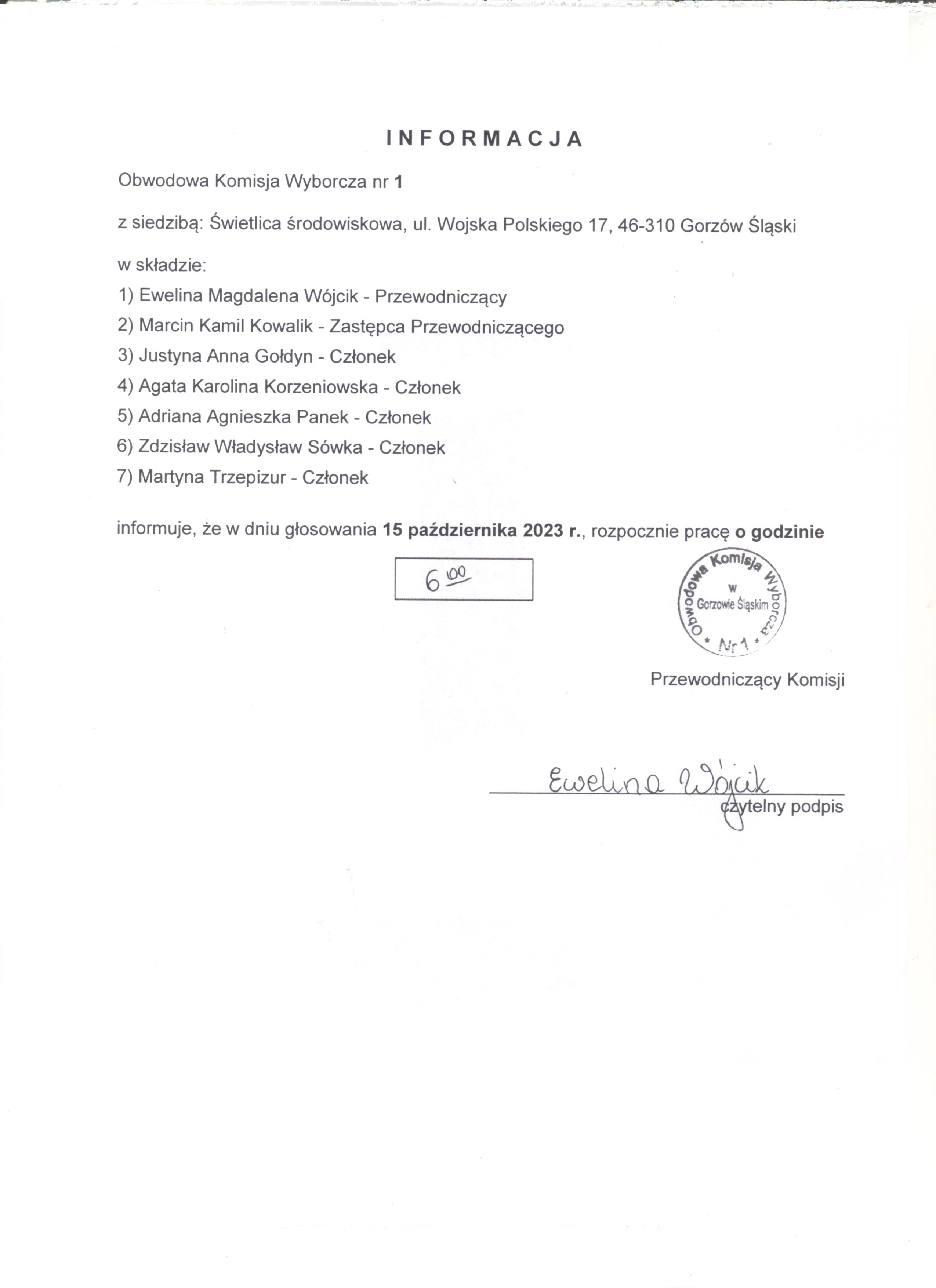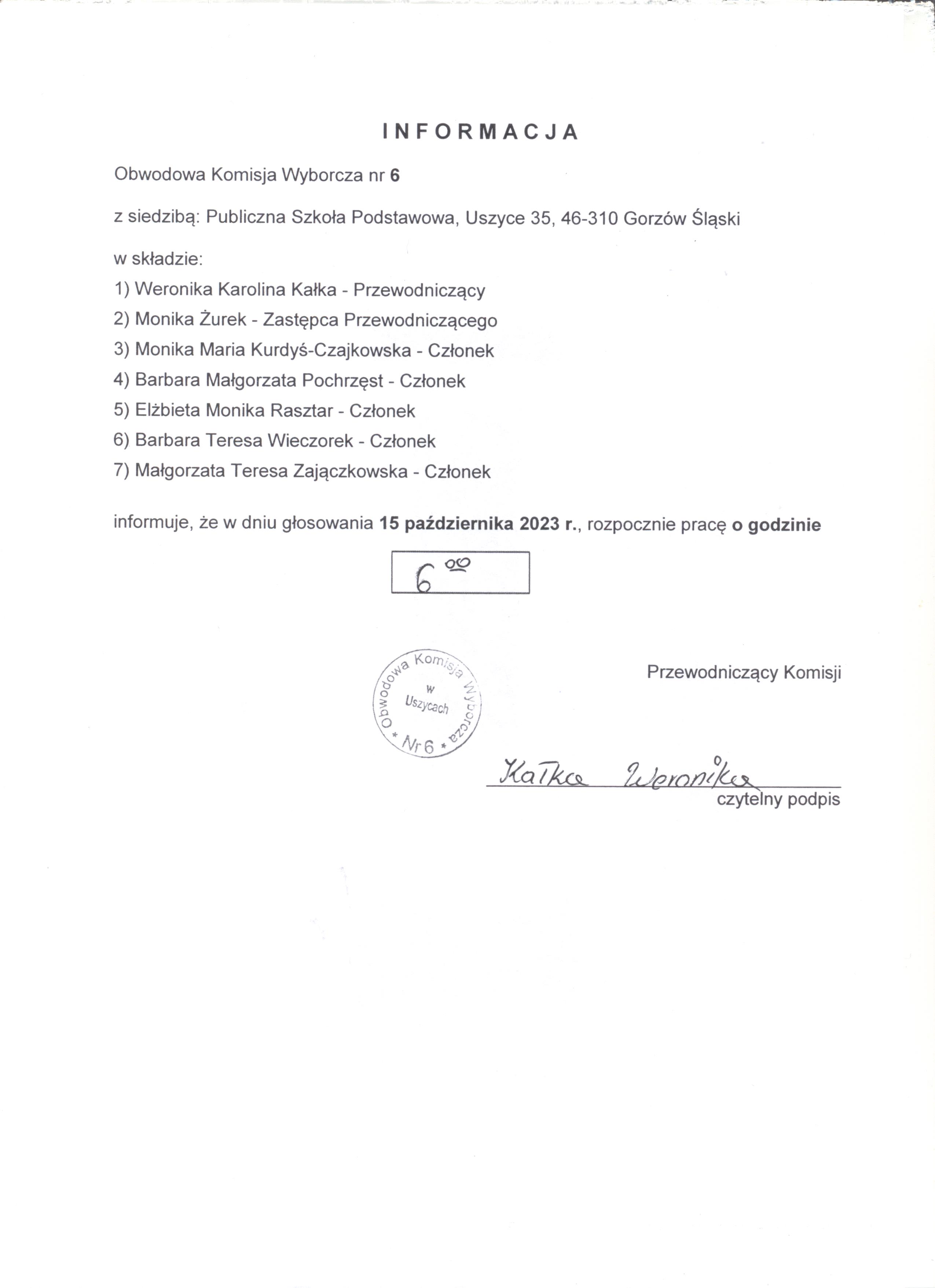 informacja o godzinie rozpoczęcia prac Obwodowych komisji wyborczych