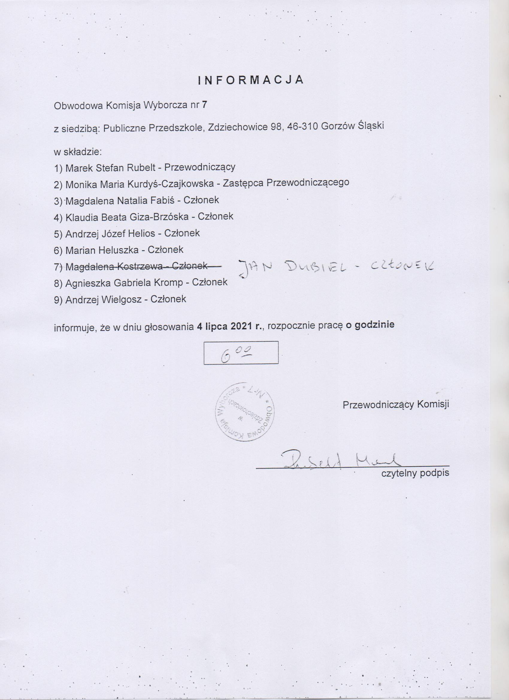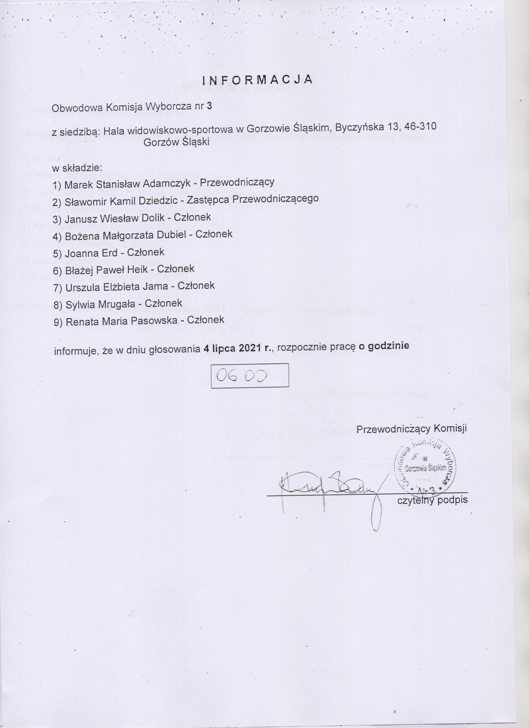 Informacja OKW w sprawie rozpoczęcia pracy w dniu wyborów tj.04-07-2021r.